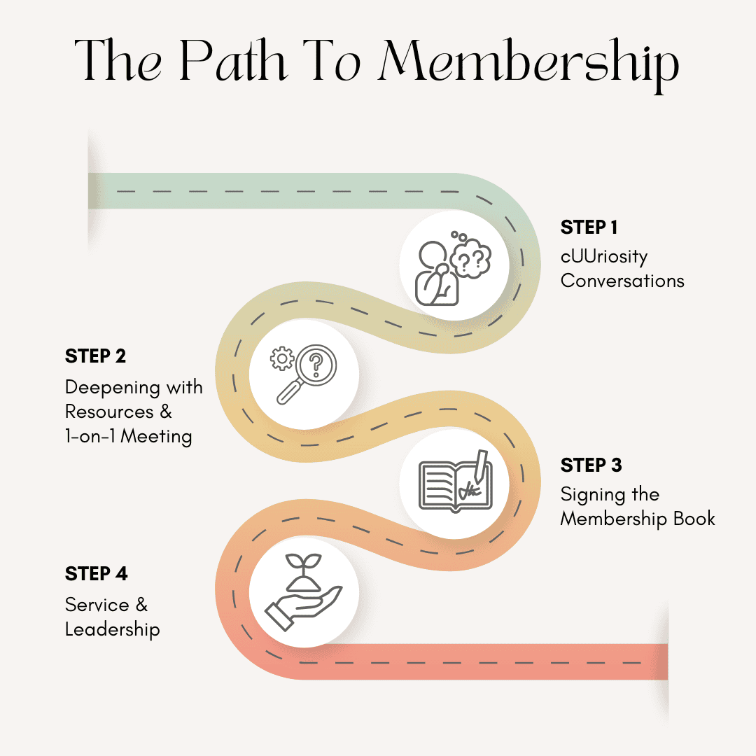 - Deepening with Resources. After expressing interest in the Path of Membership to our Congregational Life Coordinator, prospective members will receive a series of videos and articles. These will introduce you to the history of Unitarian Universalism, the story of our church, and the work of our various teams. You’ll also hear directly from some of our church leaders about their roles and the ministries they help guide. After engaging with the resources, you will reach out to the Congregational Life Coordinator to arrange a one-on-one meeting with either the minister or the Congregational Life Coordinator.